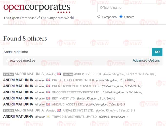 Згідно з реєстрами Андрій Матюха є директором щонайменше п’яти компаній у Лондоні та однієї на Кіпрі. Саме через ці фірми вдалося знайти зв’язок з міжнародною групою відмивачів коштів.