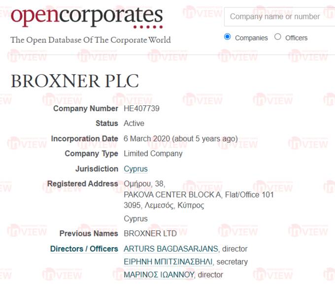 Серед директорів кіпрської компанії Матюхи Trimgo investments limited можна побачити людину, на ім’я Артурс Багдасарджанс (Arturs Bagdasarjans). Він же керує заснованою у березні 2020 року компанією Broxner PLC.