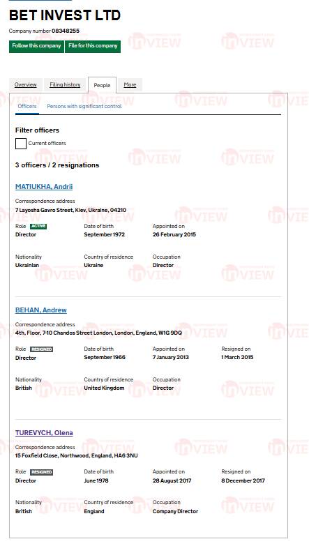 З 2015 року Андрій Матюха керує ще однією лондонською фірмою Bet invest LTD. Разом з ним у засновниках раніше значилась громадянка Великої Британії Олена Туревич. Вона ж очолювала низку фірм, зареєстрованих на Яна Тейлора та деяких інших українців.