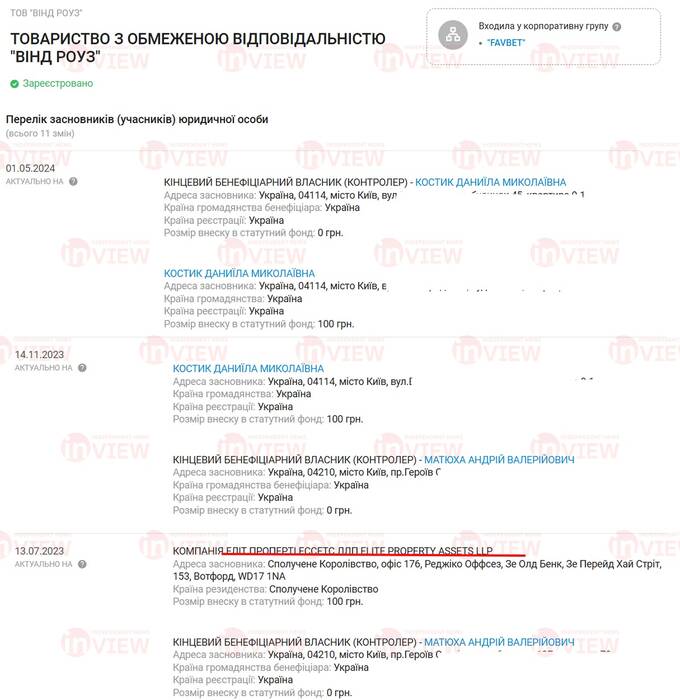 В українських реєстрах вона згадувалась серед засновників ТОВ «Вінд Роуз». До листопада 2023 року Матюха був бенефіціаром цієї київської фірми. Зараз її переписали на Даніїлу Костик, з якою він пов’язаний через ТОВ «Гастротур». Цікаво, що жінка є керівником чи учасником майже 50 компаній, зареєстрованих в різних куточках України.