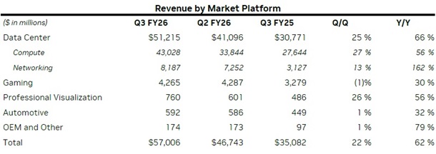 Ігровий підрозділ приніс $4,3 млрд – на 30% більше в річному вимірі, але становить лише 7,5% від загальної виручки Nvidia. У порівнянні з попереднім кварталом показник знизився на 1%, оскільки компанія приводила складські запаси до норми перед сезоном великих розпродажів. Зростання в річному розрізі пояснюється популярністю архітектури Blackwell.
